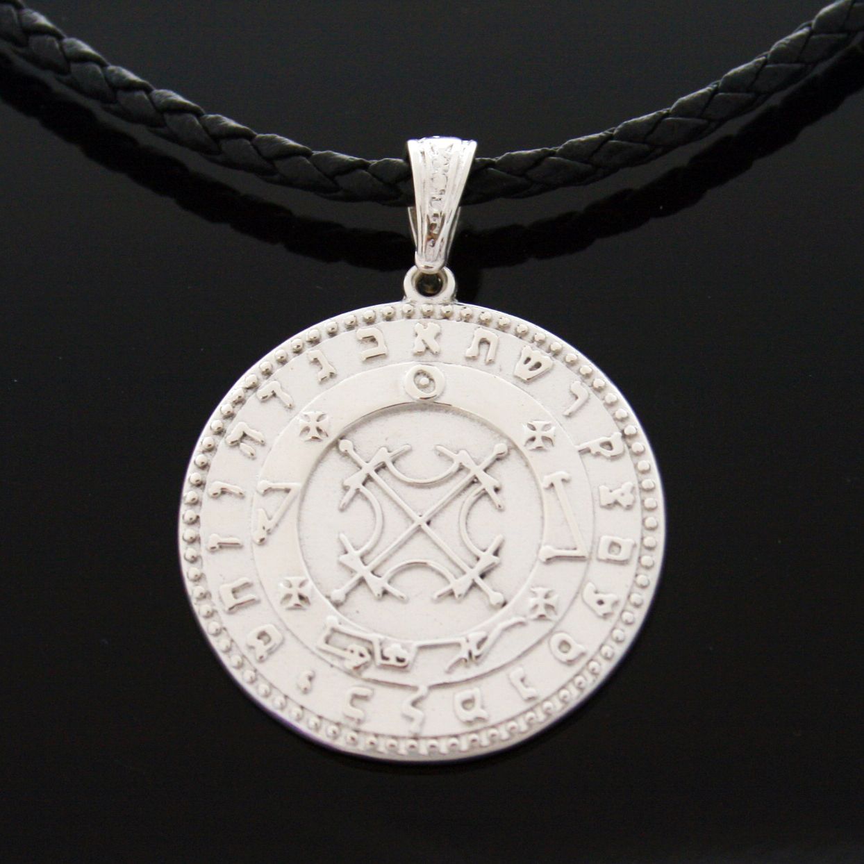 Peça confeccionada em Prata 950. **Consulte-nos para opção da peça banhada a ouro. Pantáculo do Sol Com este selo é possível proteger-se de todas as adversidades e toda a pessoa que merecer possuí-lo estará sujeita às suas virtudes maravilhosas como: felicidade para os empreendimentos, ser estimada por todos e obter favores dos grandes. Obs: Cordão de couro não incluso. Largura: 3.30 cm Peso: 17 g